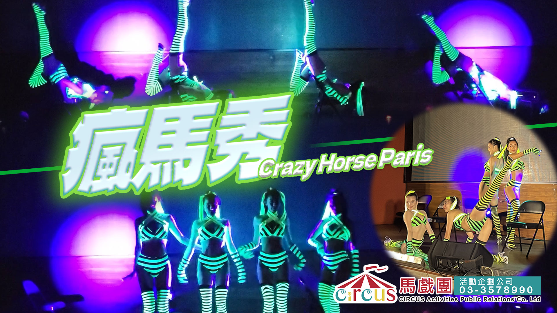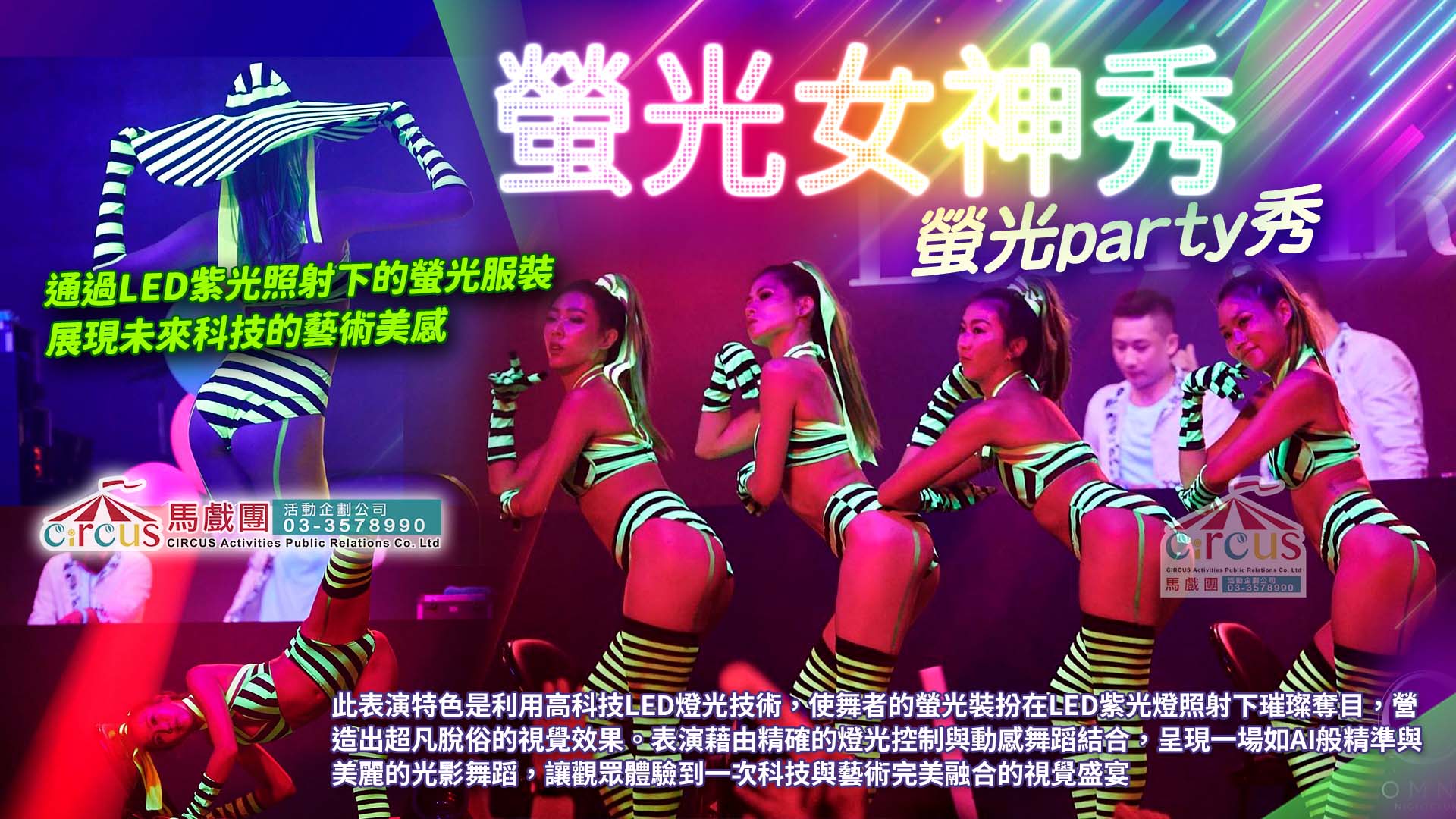 結合性感瘋馬秀元素與螢光舞蹈科技,展現極致律動與舞台美感。可搭配企業主題客製演出,從服裝, 音樂到燈光節奏皆可調整,營造專屬氛圍。
